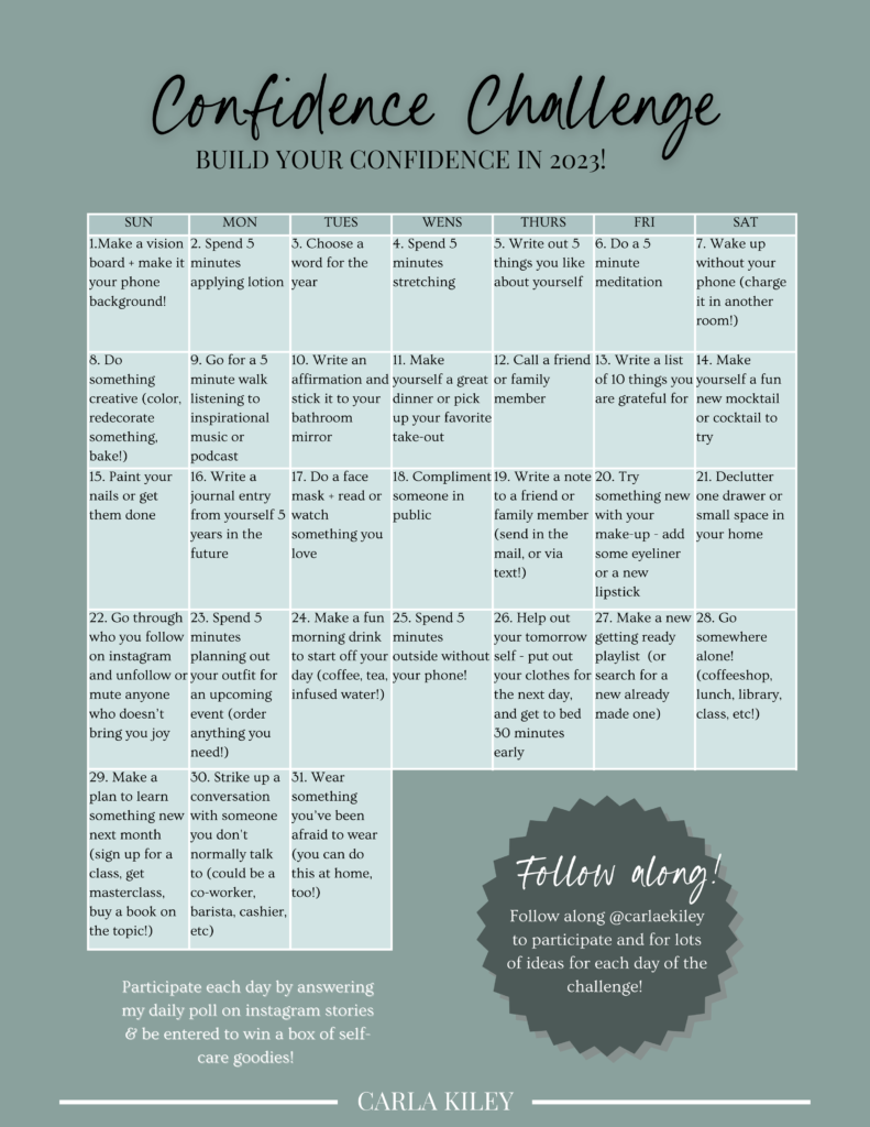 Cross off each day as you complete the prompt. Check in on @carlaekiley instagram stories and answer the poll so I know you completed the challenge! Optional but encouraged – share on your instagram stories or tiktok how you are participating and tag me @carlaekiley!