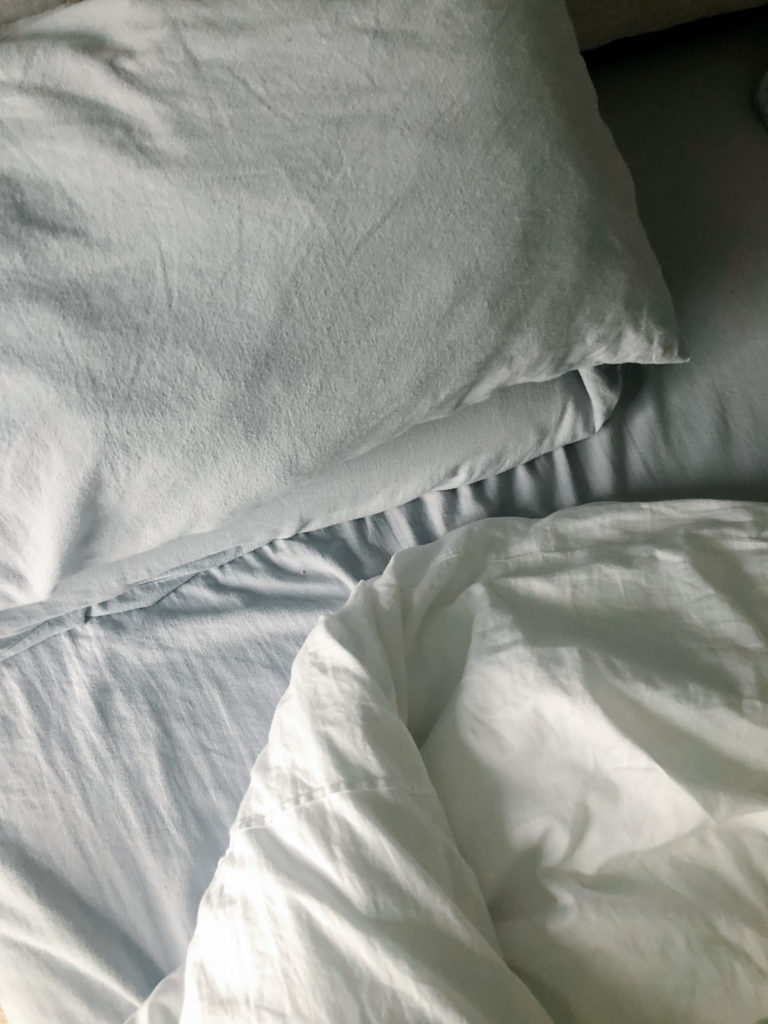 Two words. Flannel Sheets! Max and I got some pretty dusty blue/gray flannel sheets from Costco this month and we are loving them. (I think they might be sold out now, so shop a similar set here.) Some people think flannel is too warm but I think it’s perfect for this season. We don’t keep our heat very high so it’s helpful to have an extra cozy layer in our bed.