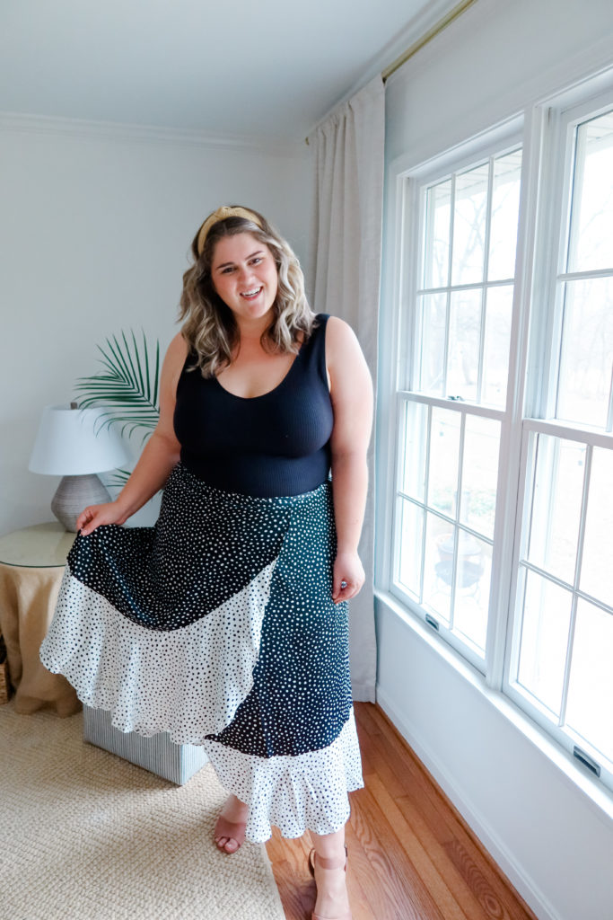 A few weeks ago I came across this gorgeous wrap skirt from Summersalt and I knew I had to have it! With summer coming up, I knew I wanted to get a few new nicer pieces I could wear for years. I picked the black and white option because I thought it would match more of the items in my closet, but it also comes in a few other patterns that are so cute! This skirt is great because it’s a true wrap skirt so it’s super customizable. I also love the fabric – it’s really light and breezy for the summer. For reference, I ordered the 2x in the skirt and it’s perfect, the 1x probably would have also worked.